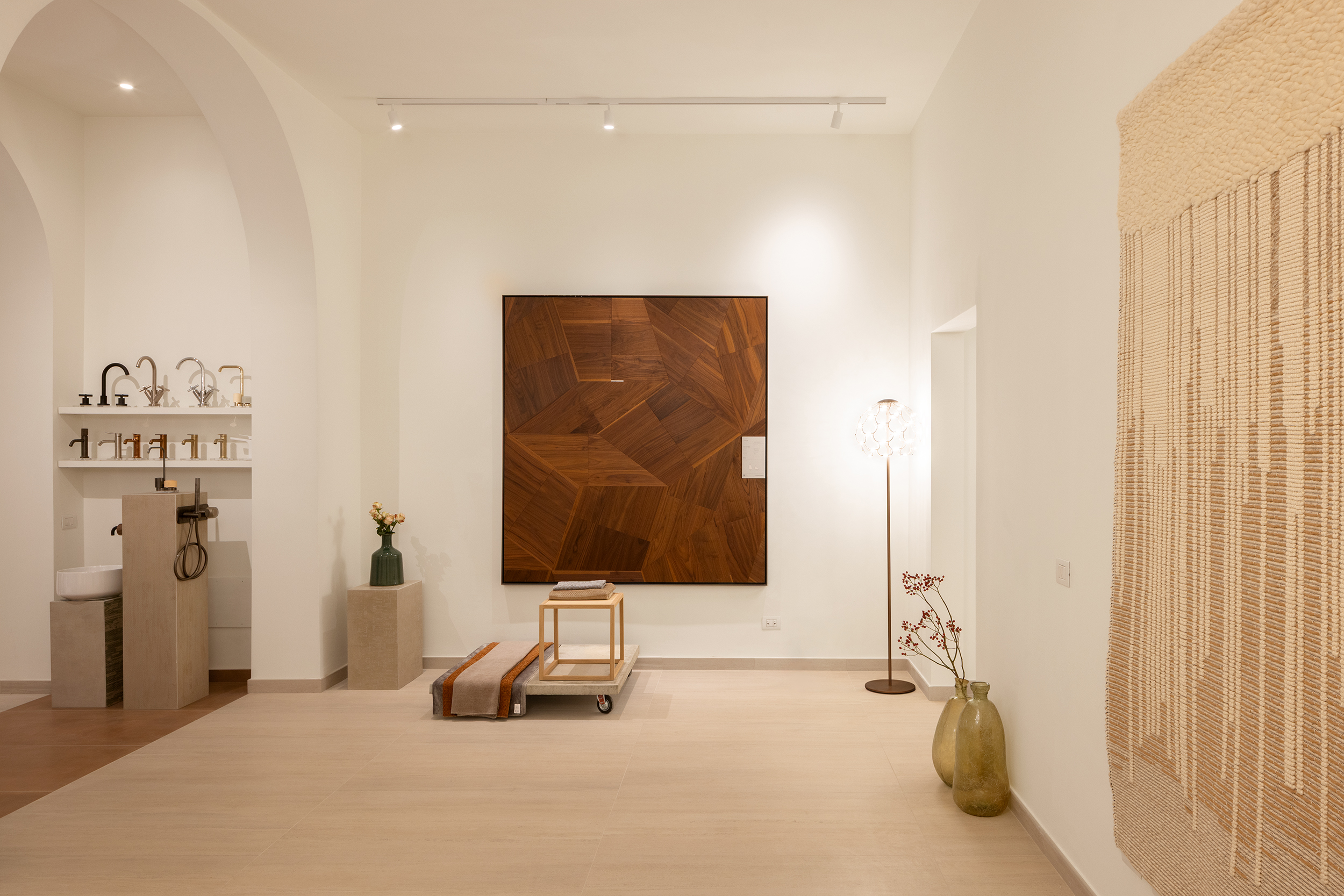 Le ceramiche di Abitzai esprimono la bellezza e la sostanza del territorio d’origine — tra cui spicca la collezione Origini del designer Celestino Sanna — accanto ad alcuni dei più importanti brand italiani dell’interior design: gli arredi di Plinio il Giovane, i tessuti di Dino Zoli Textile, il legno di Listone Giordano, le luci di Sforzin Illuminazione, i miscelatori di Fima – Carlo Frattini e i tappeti di Mariantonia Urru. Un percorso sensoriale unico che valorizza materia, luce e superficie come elementi centrali di un nuovo abitare, volto a promuovere la cultura del design mediterraneo contemporaneo e a creare connessioni tra produttori, artigiani, architetti e designer.