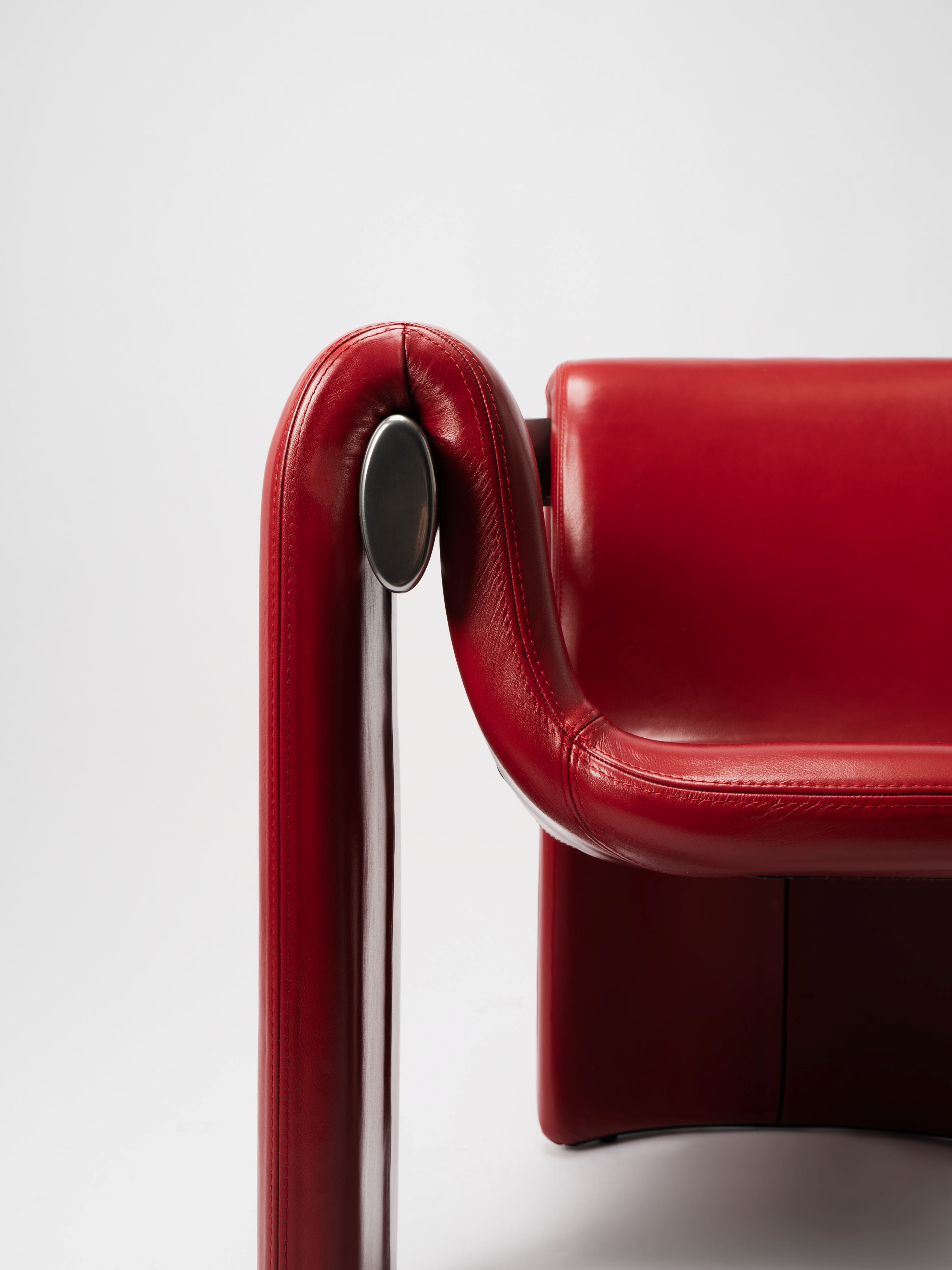 All’interno del percorso è stata presentata anche Sari Imago, versione evoluta della seduta, che rappresenta il compimento della metamorfosi. Sari Imago, che entrerà a catalogo Paolo Castelli® come capsule 2026, introduce braccioli in acciaio naturale e un rivestimento in pelle (nei colori rosso acceso, giallo, nero) mantenendo l’identità originaria e rafforzando il dialogo tra struttura e superficie.