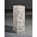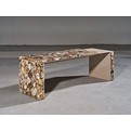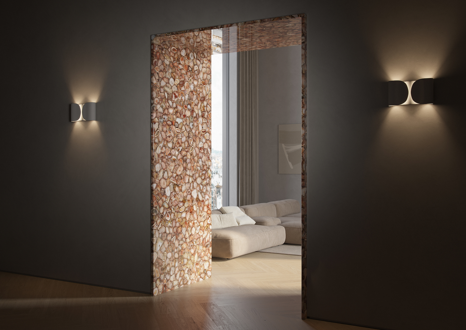 tagliate manualmente sono accostate fra di loro in composizioni calibrate e tenute insieme con resine che garantiscono la resistenza e durabilità delle lastre finite, da cui si ricavano pannelli su misura per rivestimenti, pavimentazioni, piani di lavoro, ma anche elementi di arredo e oggetti-scultura.