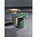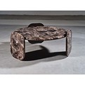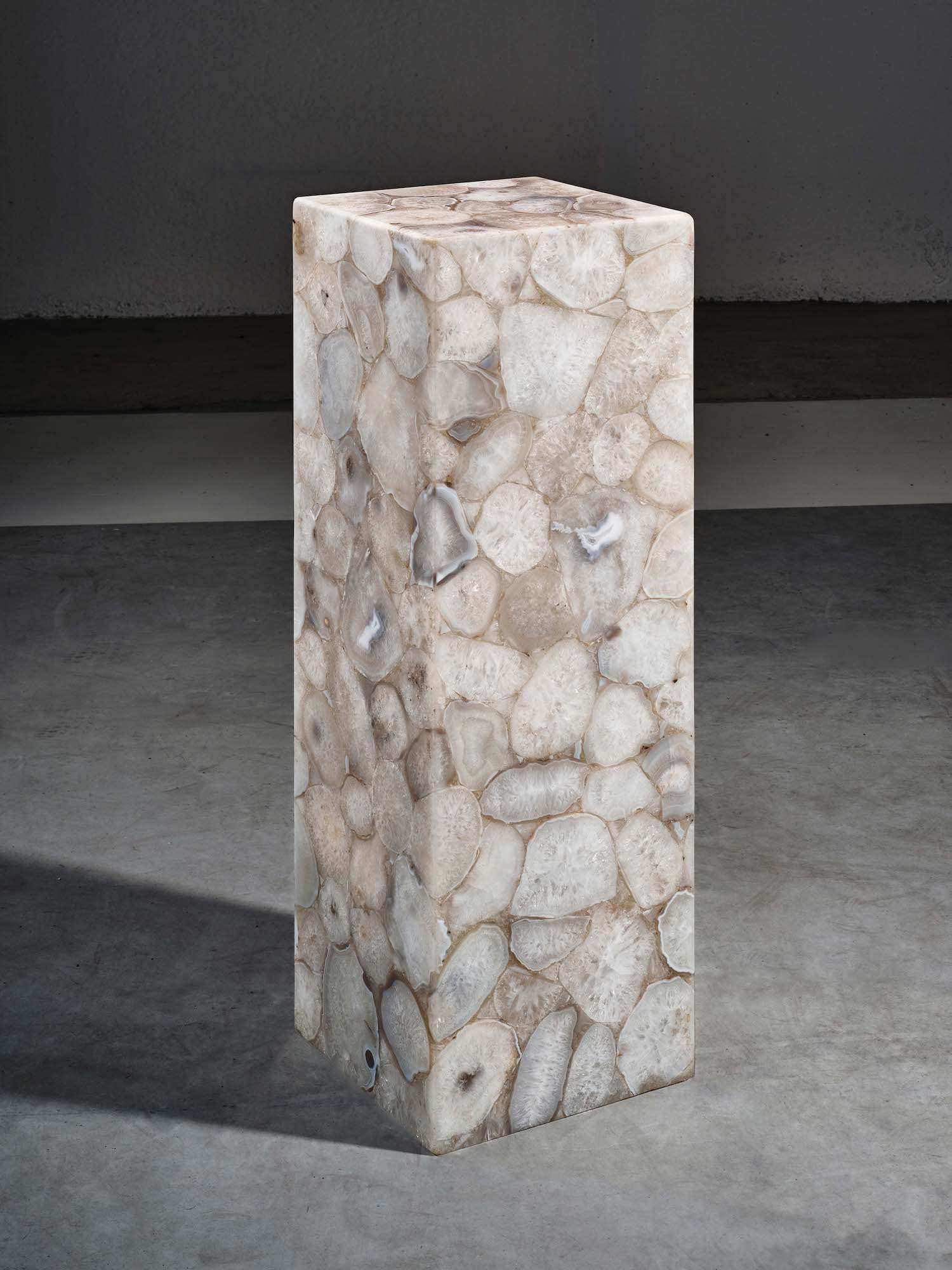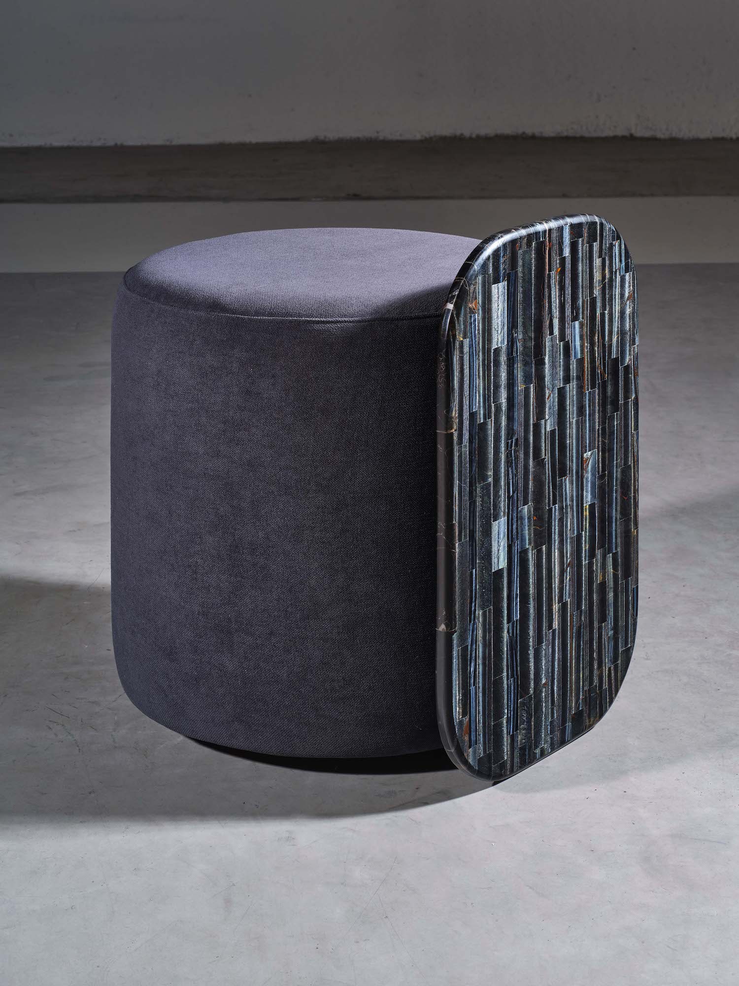 designer in un progetto corale. Tavoli e complementi prendono forma in un dialogo equilibrato fra la potenza visiva delle texture dei semipreziosi e le campiture piene ottenute dalla verniciatura del metallo. Le forme scultoree e monolitiche esplorano la purezza delle geometrie o la tattilità delle linee stondate evocando scenari primordiali, un lusso sussurrato, in cui il naturale decoro della pietra diventa elemento generativo del progetto.