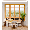 Attorno al tavolo trovano posto 4 confortevoli poltroncine CHIC - design Riflessi Lab - con rivestimento in pelle chiara e base in legno di frassino tinto coke.