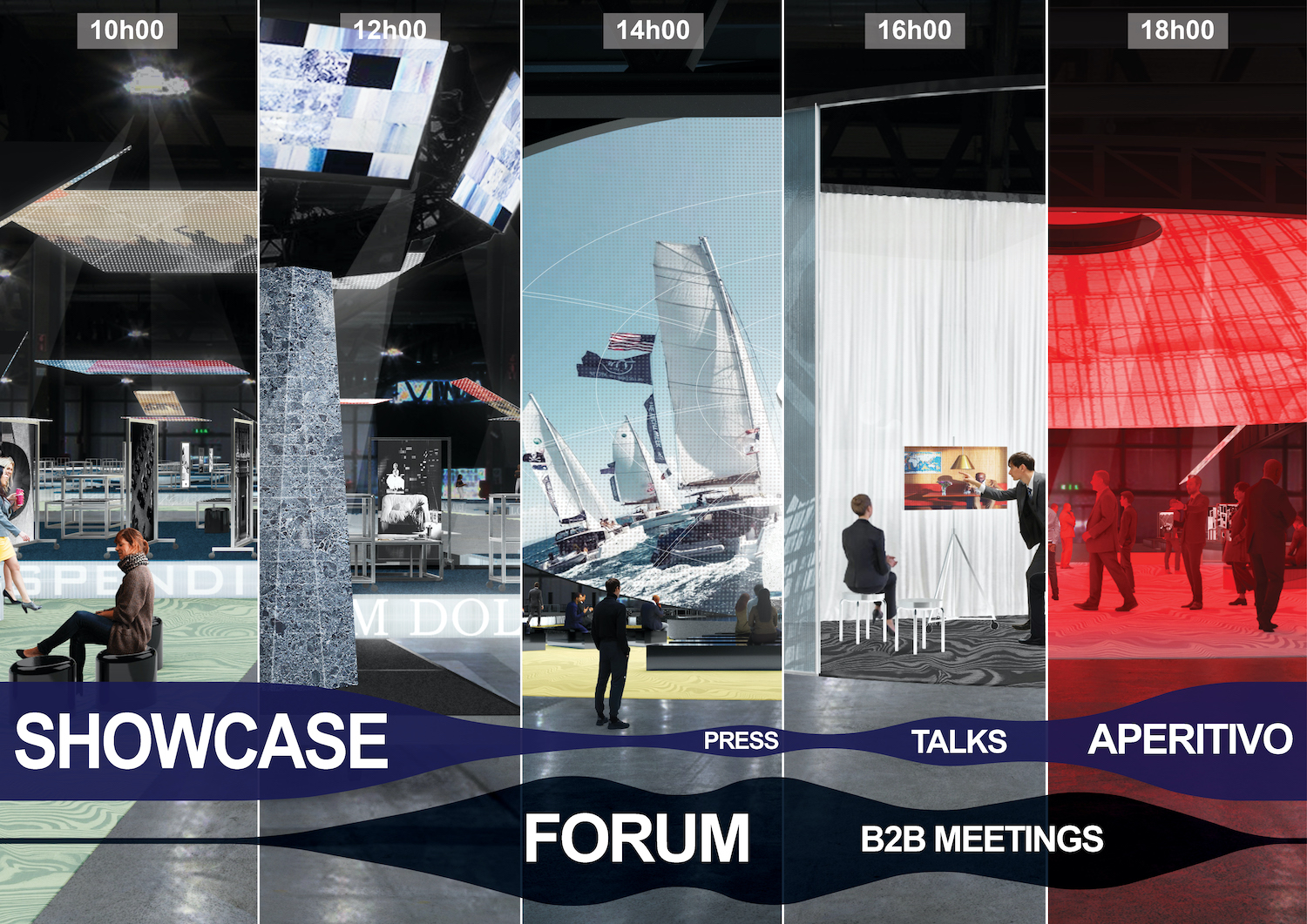 manifestazione, riconfigurando periodicamente le gerarchie spaziali e spostando l’attenzione su settori differenti. Alle intersezioni tra i cluster, le arene B2B ospitano incontri one-to-one, momenti informali e appuntamenti di piccola scala. Aperte a tutti i partecipanti, consentono una trasformazione continua del programma e della loro stessa identità anche nell’arco di una sola giornata.