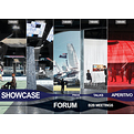 Le piattaforme espositive compongono i blocchi della borsa e si distribuiscono in quattro zone tematiche che riflettono i principali segmenti del Contract: workspace, hospitality e residential, spazi pubblici e nautica. La loro struttura modulare definisce un linguaggio visivo coerente, capace di rafforzare apertura e continuità nello spazio. Ogni zona è completata da dispositivi multimediali proiettati, pensati per orientare i visitatori e rendere leggibili gli attori e le offerte di ciascun cluster.