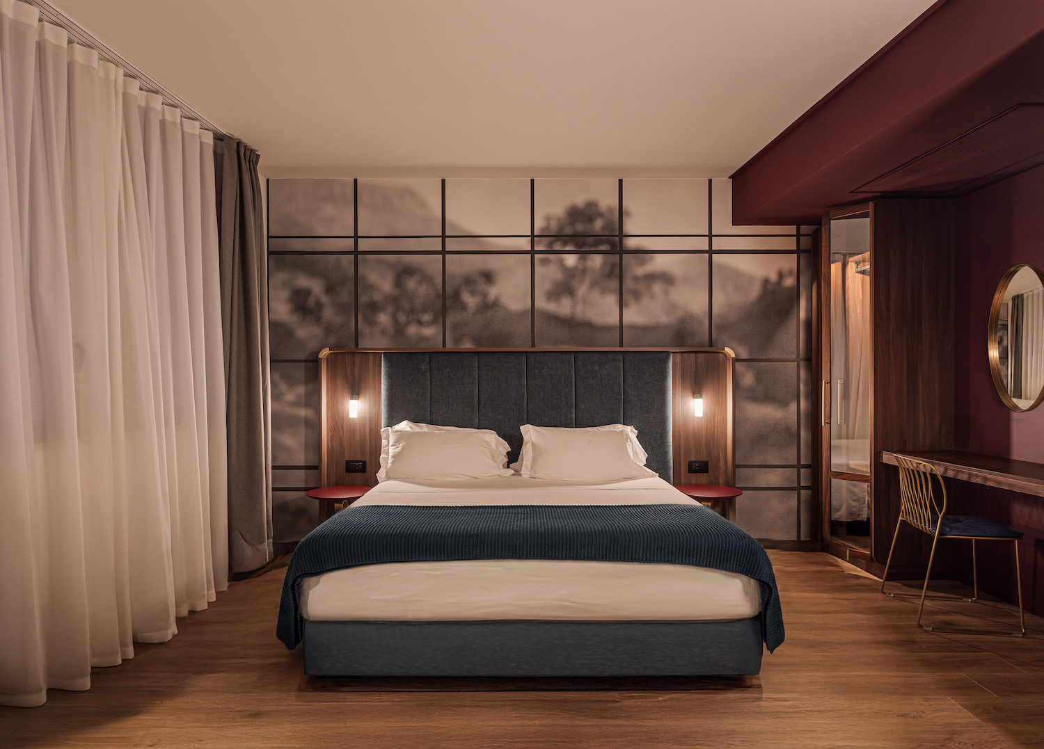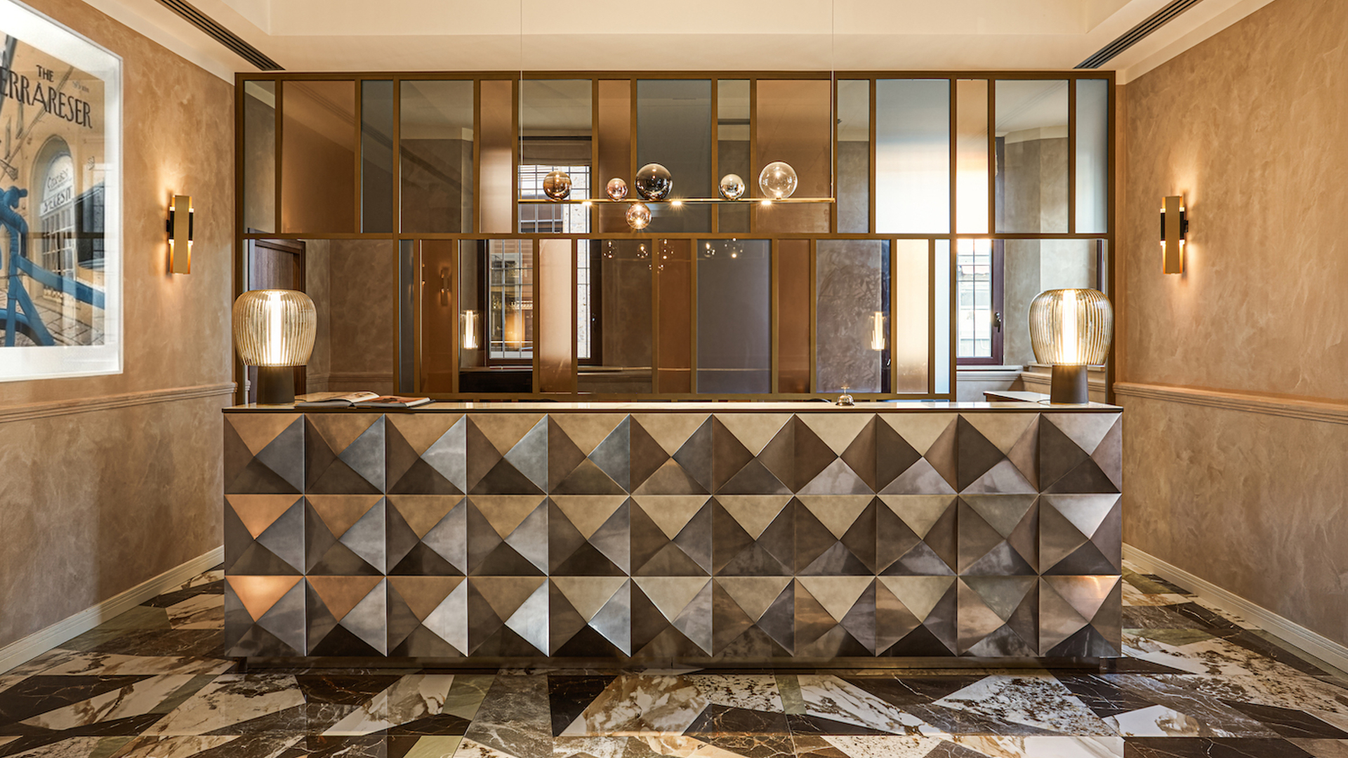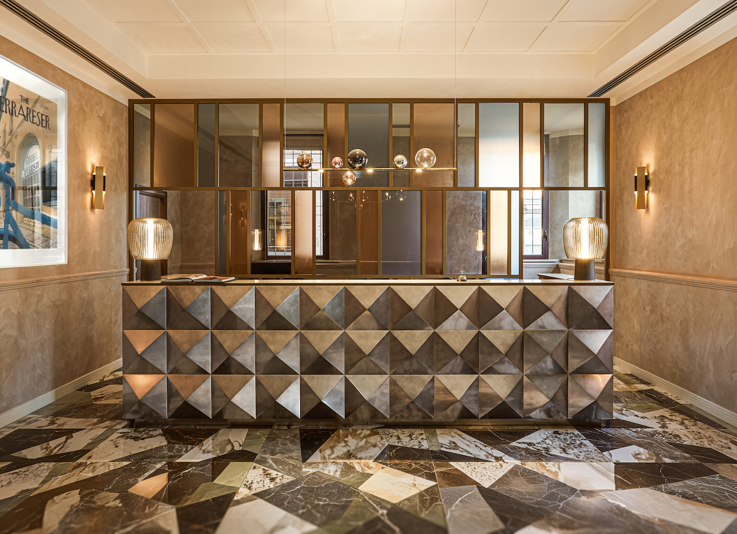 Il cuore pulsante dell’hotel è il Palazzotto, spazio di accoglienza e socialità che si ispira alle antiche dimore rinascimentali. È qui che si concentrano le principali attività collettive, la hall, la zona lounge e le aree di ristoro, concepite come un salotto urbano dove materia e luce definiscono un’atmosfera calda e sospesa. Marmo, legni scuri, velluti, superfici metalliche brunite e specchi anticati dialogano in una scenografia domestica ma teatrale, che racconta la nobiltà discreta del vivere ferrarese.