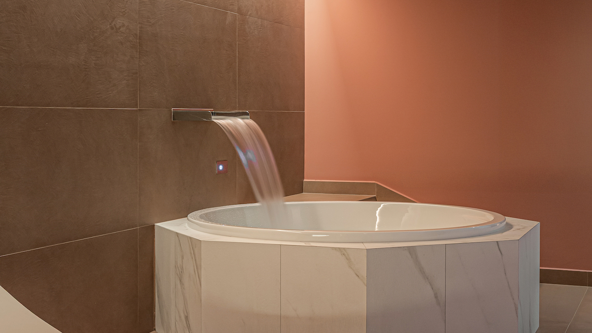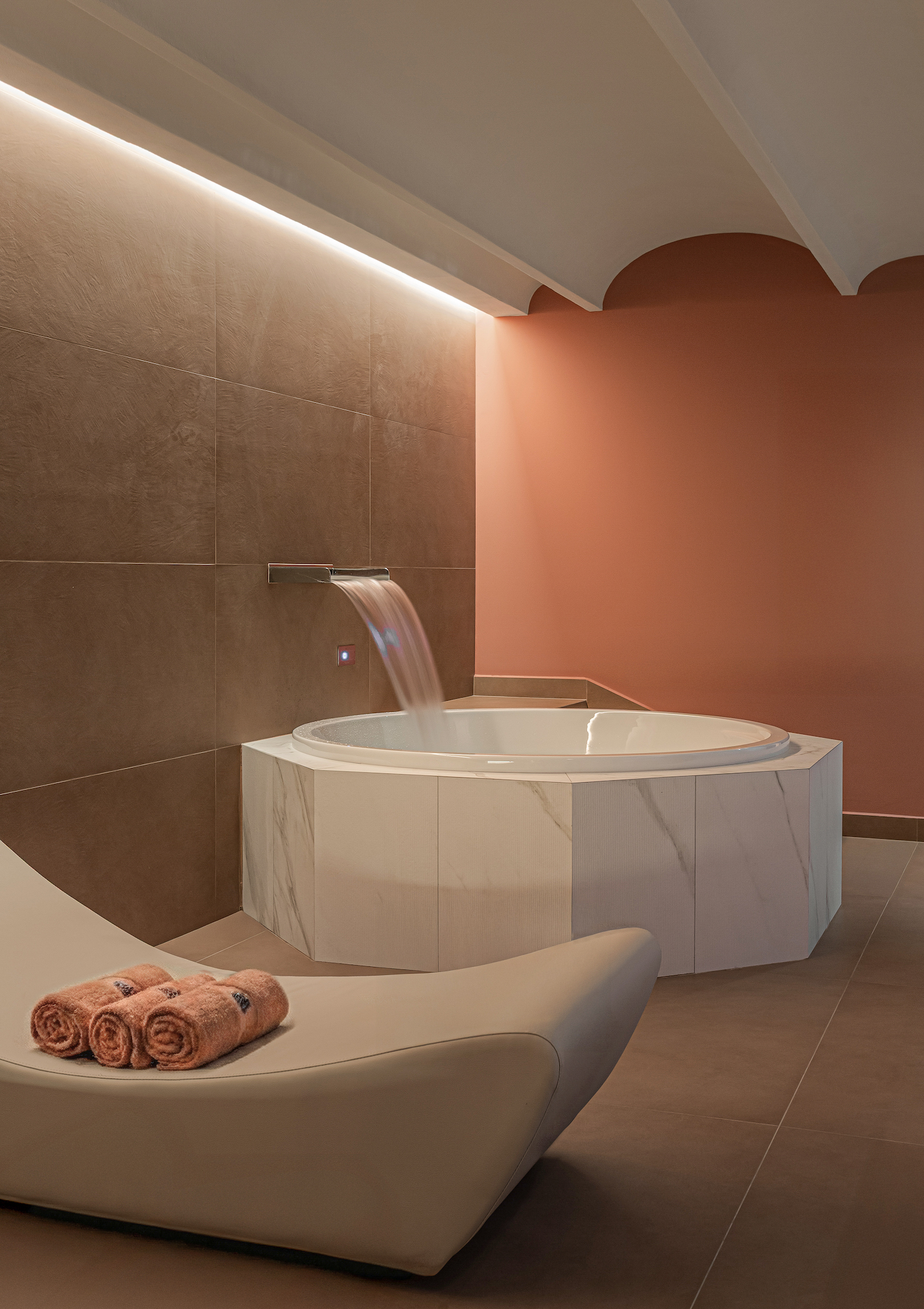 Le suite, invece, sono concepite come residenze private: spazi appartati e riservati, con accessi indipendenti e servizi personalizzati. Un modello di ospitalità non standardizzata che risponde al nuovo modo di viaggiare, dove l’esperienza è unica, irripetibile e legata al luogo. Chiamata Salus, la SPA è un tributo al concetto di benessere inteso come rigenerazione. L’ispirazione arriva dalla simbologia del sacro, in particolare dalla Cattedrale di San Giorgio: le geometrie ottagonali della fonte battesimale vengono reinterpretate in chiave sensoriale, dando vita a un luogo di calma e introspezione. Tonalità cipria e avorio, marmi chiari e legni caldi creano un’atmosfera sospesa, dove la luce si diffonde in modo morbido e silenzioso. L’acqua diventa elemento purificatore, il suono un dettaglio architettonico, l’esperienza un rito contemporaneo.