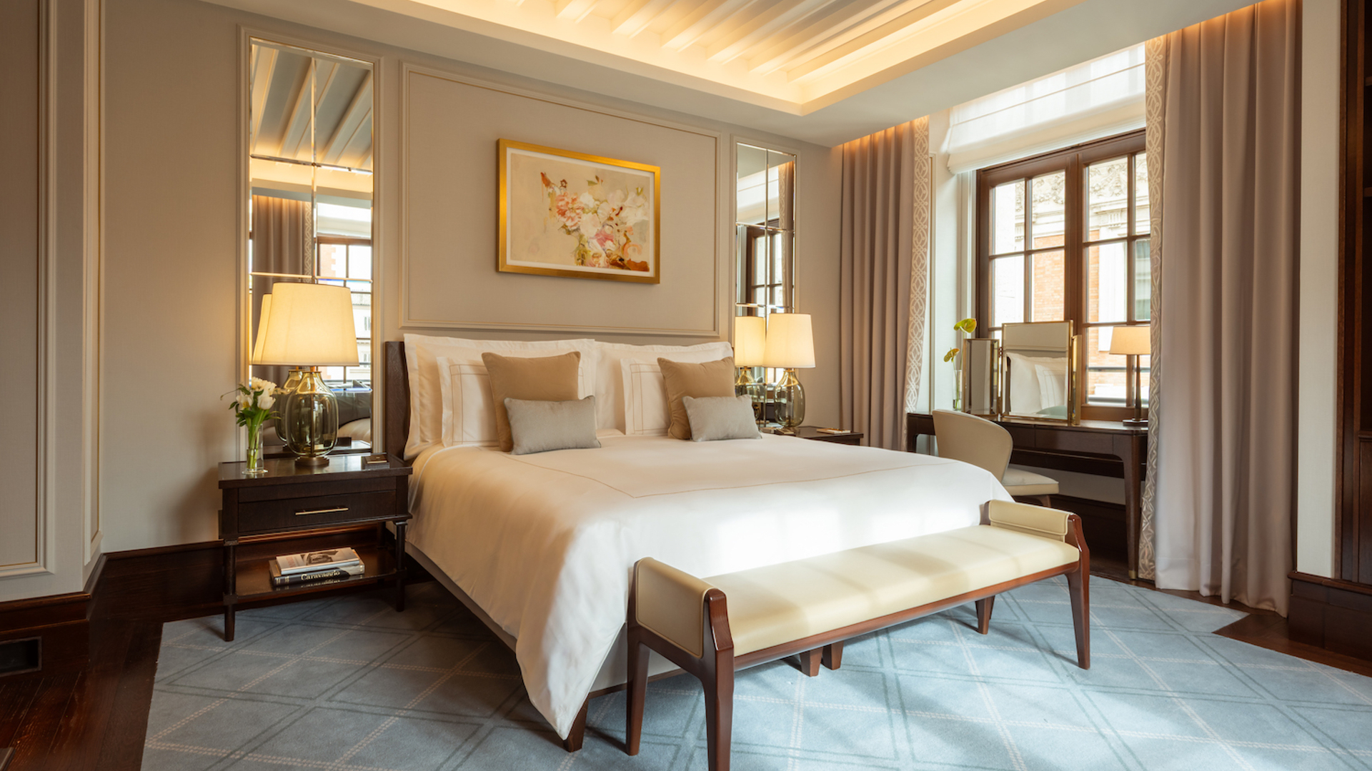 Le 60 camere e suite, di cui 21 suite, sono concepite come residenze private all’interno della dimora. Gli spazi sono ampi, luminosi, silenziosi, con soffitti alti e finestre che incorniciano scorci di Roma o la corte interna. Ogni ambiente combina elementi storici ricostruiti e arredi contemporanei, creando un equilibrio naturale tra eleganza e comfort. Le suite rappresentano l’espressione più alta di questo concetto abitativo: dalle Campo Marzio Suites sviluppate su due livelli, alla Chigi Suite con terrazza panoramica sui tetti della città, fino all’Arte Suite, alla monumentale Theodoli Heritage Suite e all’Aurea Penthouse, attico ispirato alla Domus Aurea e pensato per vivere Roma dall’alto, in totale intimità.