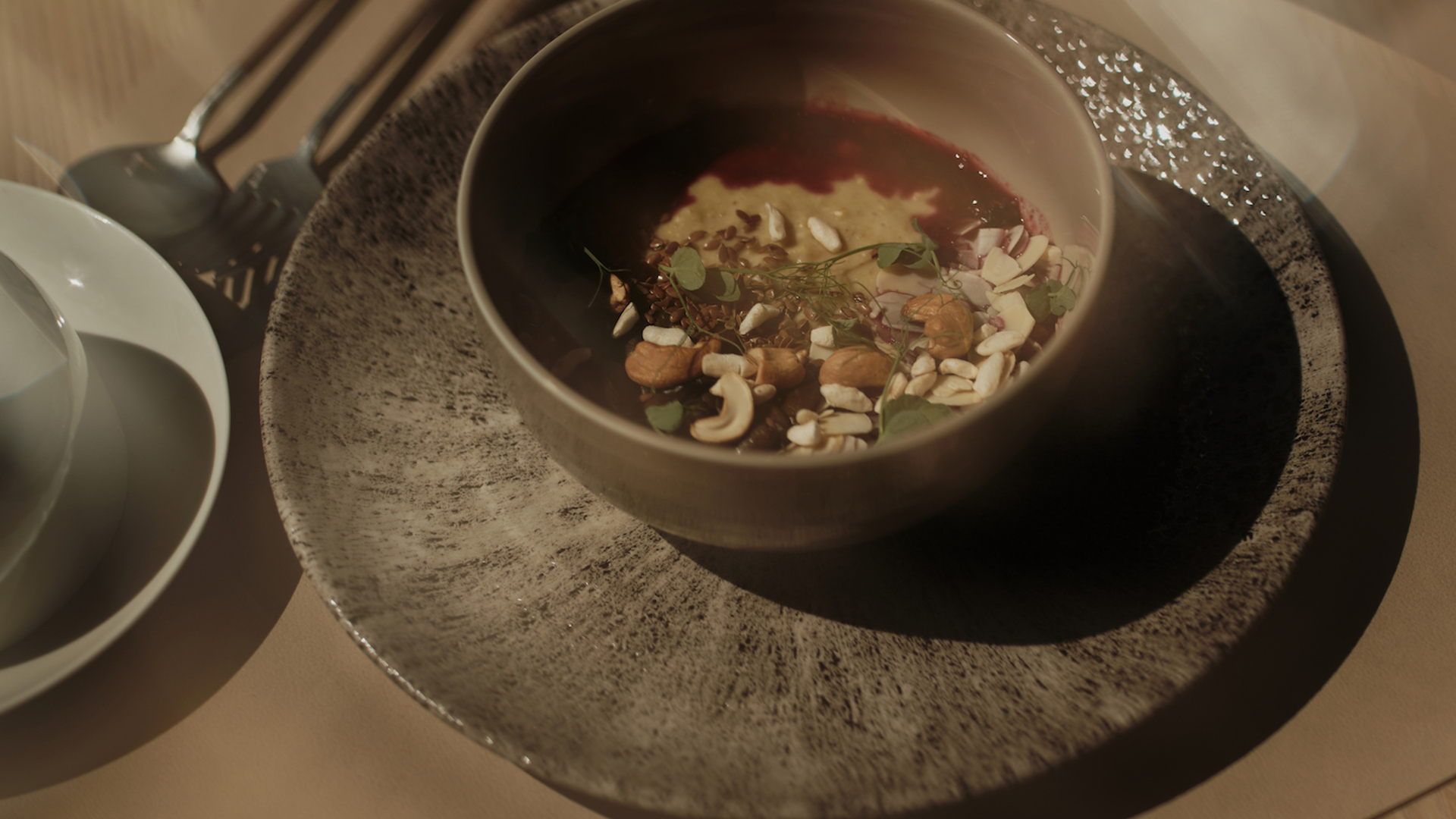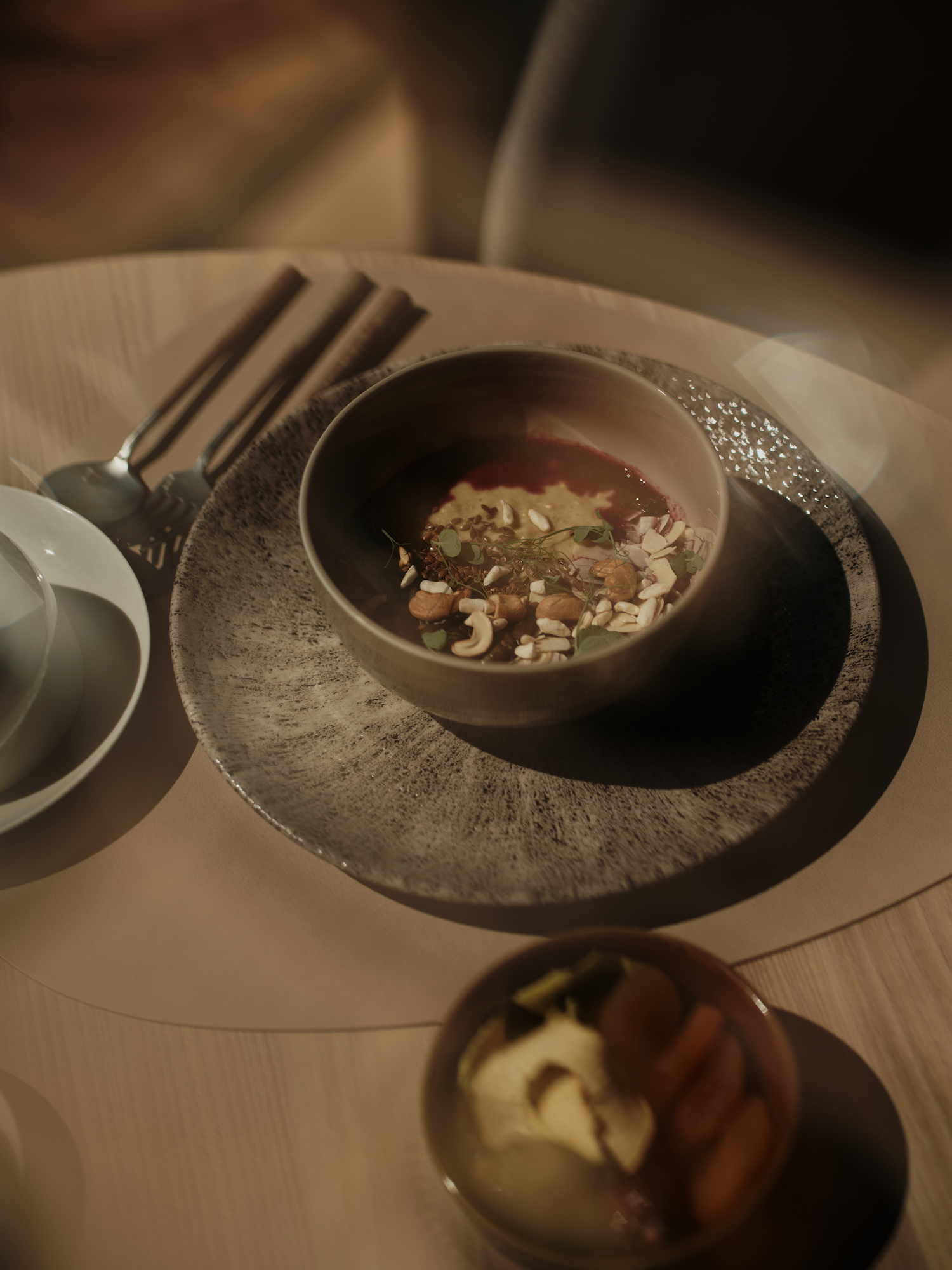 L’arrivo ad Ayurpura coincide subito con un primo elemento distintivo: la cucina. Il ristorante segue infatti una linea ayurvedica rigorosa. I pasti sono vegetali, equilibrati e calibrati secondo i principi di questa tradizione, senza la consueta scelta à la carte. All’inizio può sorprendere: chi arriva con l’idea di un weekend gastronomico di montagna si trova invece di fronte a un’alimentazione essenziale, composta da zuppe, verdure, piatti leggeri e preparazioni curate ma misurate nelle quantità. È una scelta coerente con l’impostazione della struttura, che invita fin dall’inizio a uscire dalle abitudini quotidiane.