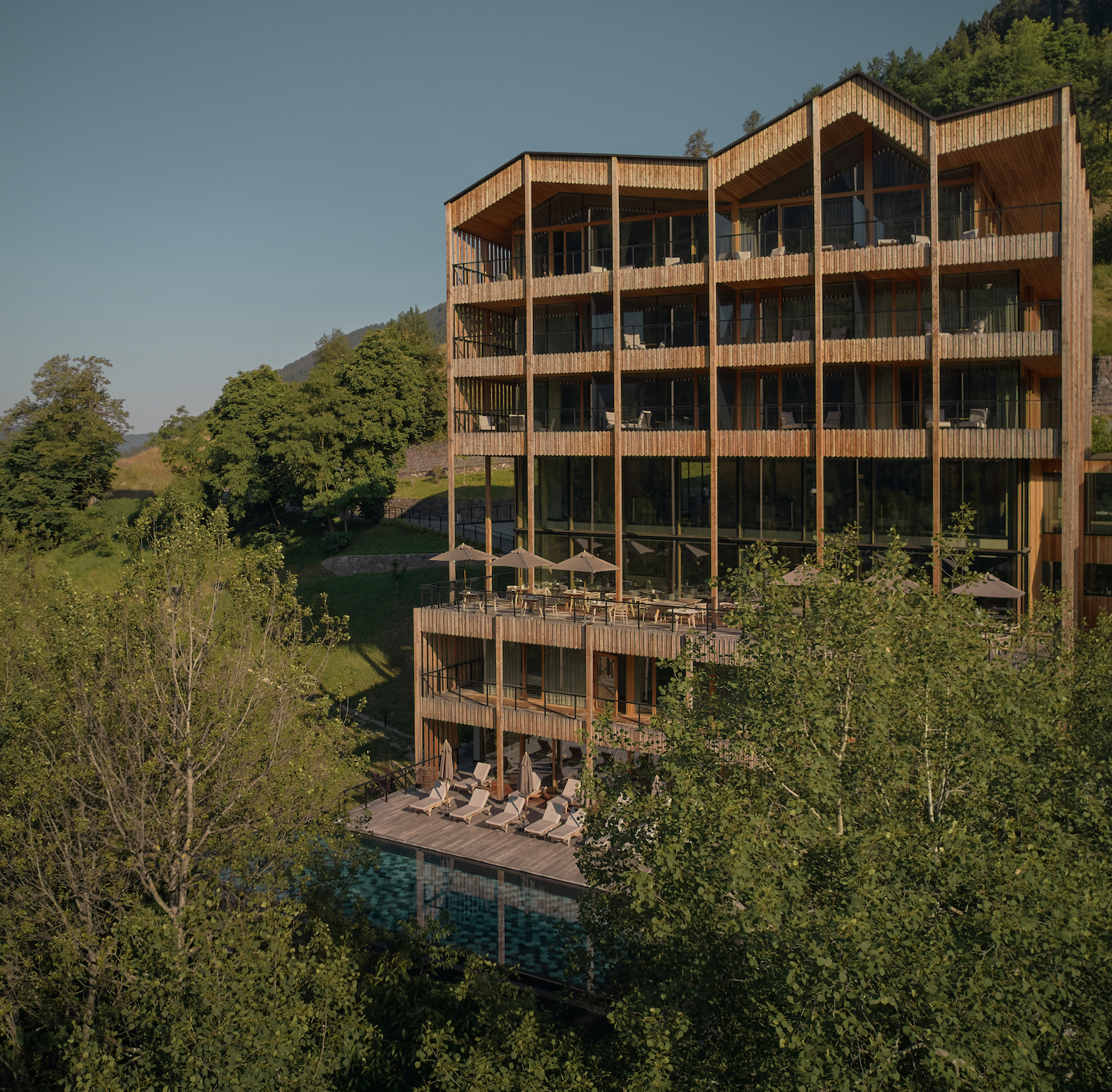 Ayurpura nasce accanto a una struttura alberghiera preesistente, ma rappresenta un progetto completamente autonomo. Aperto nel 2023, questo piccolo hotel adults only – diciassette camere in tutto – è stato concepito interamente intorno alla pratica dell’ayurveda. L’architettura è essenziale e contemporanea: molto legno, tonalità chiare, grandi vetrate. Gli spazi comuni sono raccolti e silenziosi, con camini accesi che rendono l’atmosfera calda e accogliente senza risultare formale. All’esterno una piscina riscaldata guarda verso le montagne; all’interno una spa compatta ma ben organizzata e alcune sale relax invitano naturalmente a rallentare.