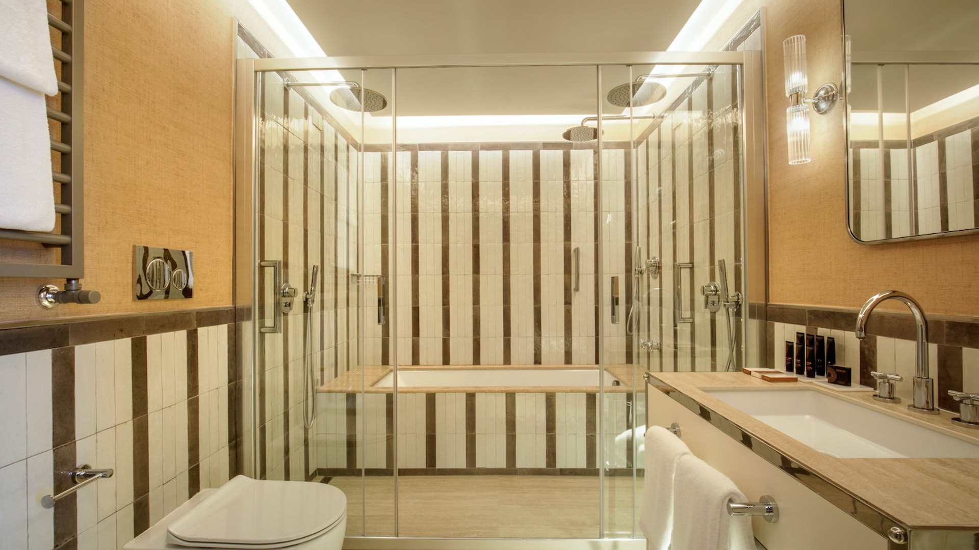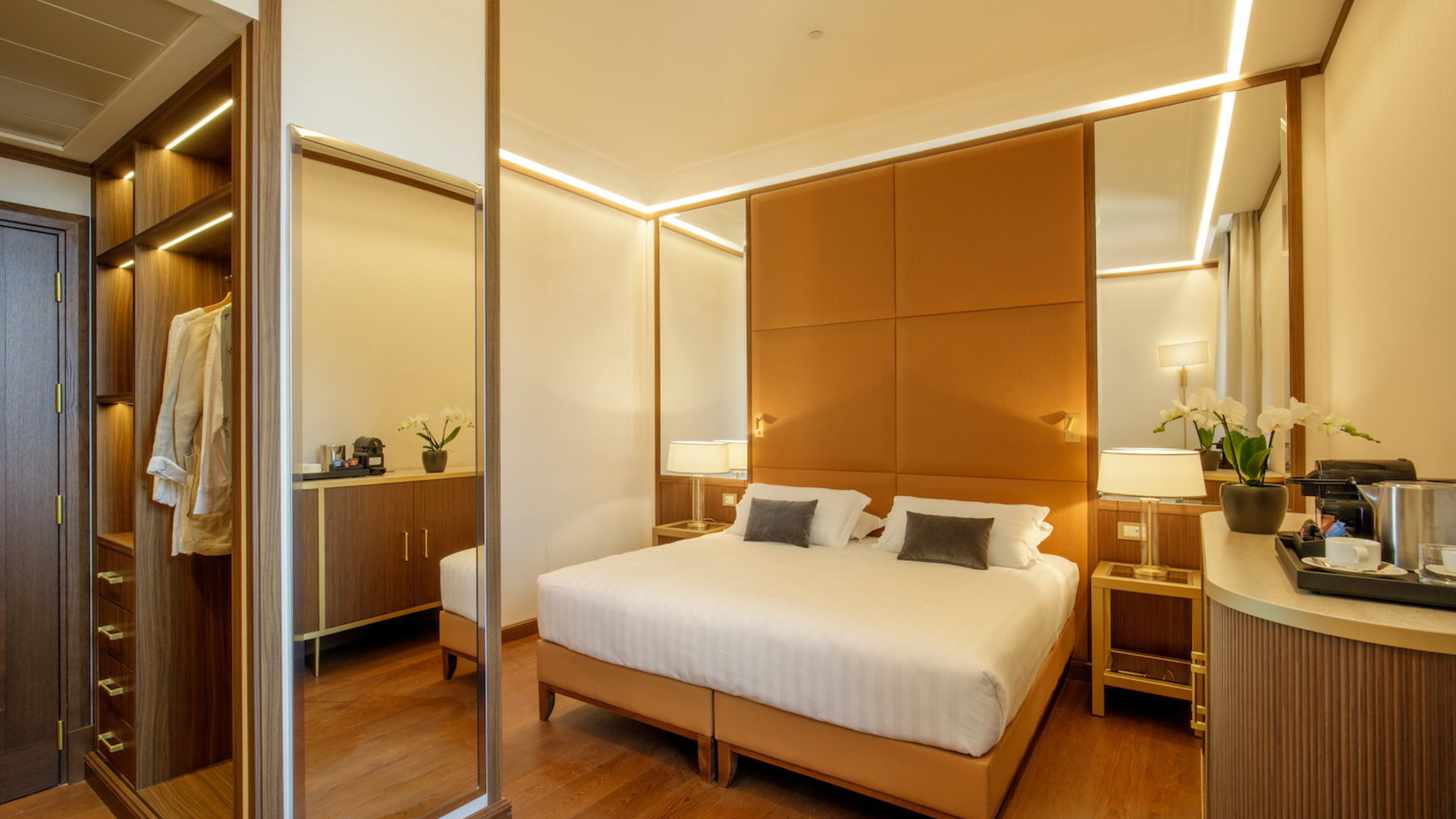 Situato nel centro, l’Hotel Imperiale, parte del gruppo Omnia Hotels, è una struttura quattro stelle superior che unisce eleganza, funzionalità e comfort contemporaneo. Su una superficie di 3.500 mq ospita 81 camere e ampi spazi comuni come reception, spa, palestra, lounge, biblioteca, veranda, sala riunioni, terrazza sul tetto e dehor, progettati per coniugare ospitalità e design. I pavimenti della hall sono in travertino e arabescato orobico multicolor levigato con posa a casellario, materiali ripresi in tutto il piano terra. Le pareti e il bancone della reception sono rivestiti in travertino cannettato. Le pareti della sala colazioni presentano invece una carta da parati che raffigura un paesaggio italiano. Il progetto si distingue per la cura delle finiture, l’uso di materiali caldi e la distribuzione funzionale degli ambienti, che favorisce comfort e continuità percettiva. L’Hotel Imperiale rappresenta così una sintesi di efficienza e stile nel cuore della capitale.